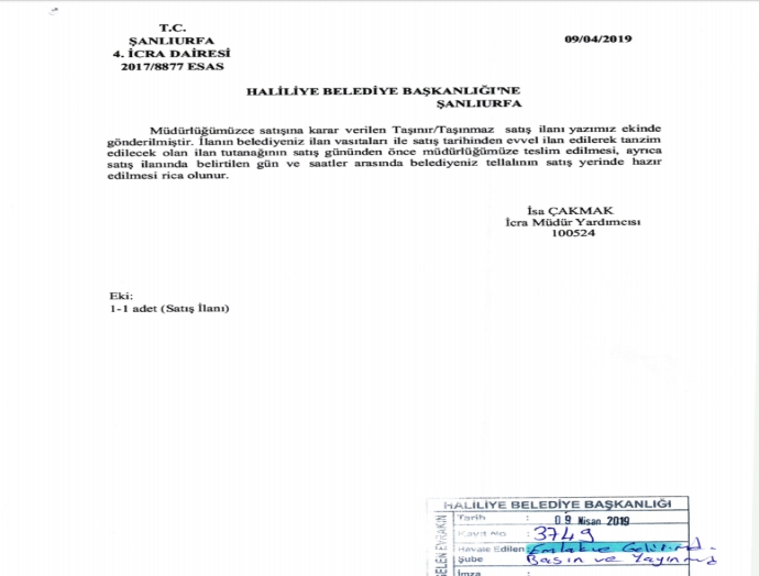 ŞANLIURFA 4.İCRA DAİRESİNİN 2017/8877 ESAS SAYILI İLAN METNİ İÇİN TIKLAYINIZ