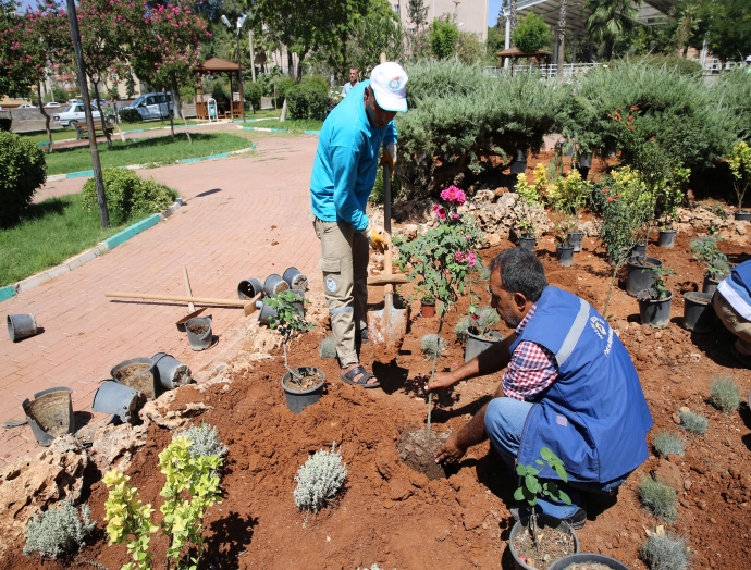 Haliliye Belediyesi, ilçe genelindeki park ve yeşil alanlarda mevsimlik çiçekli bitkileri toprakla buluşturarak Haliliye’yi güzelleştiriyor.