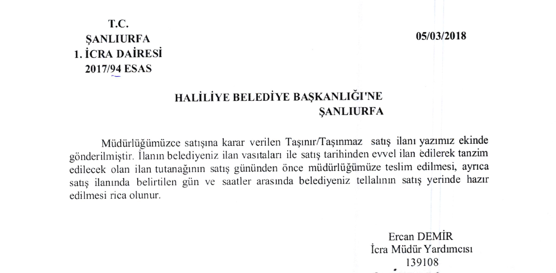 ŞANLIURFA 1.İCRA DAİRESİ 2017/94 ESAS SAYILI İLAN METNİNİN TAMAMI İÇİN TIKLAYINIZ
