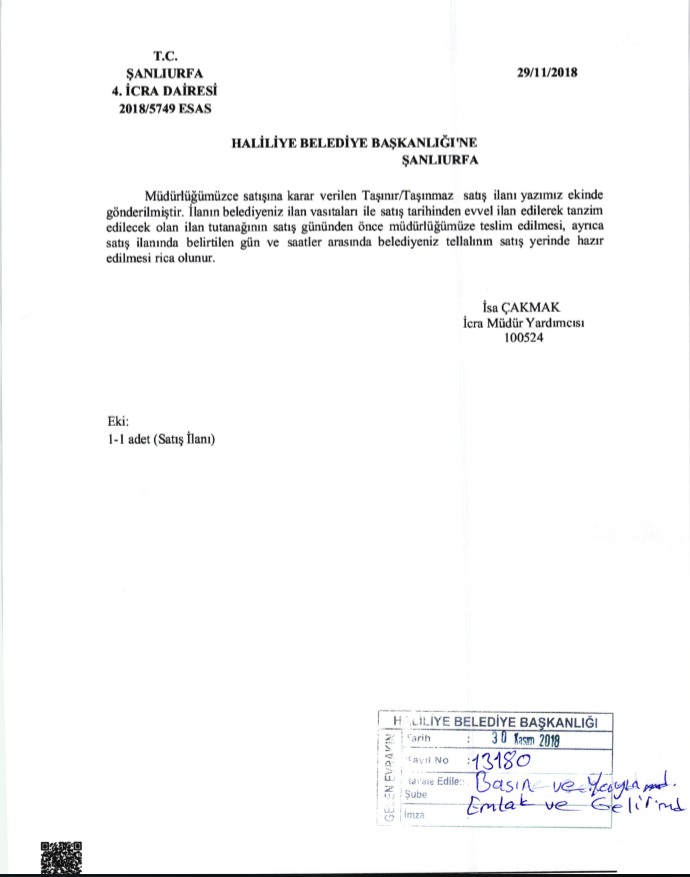 ŞANLIURFA 4.İCRA DAİRESİNİN 2018/5749 ESAS SAYILI İLAN METNİ İÇİN TIKLAYINIZ